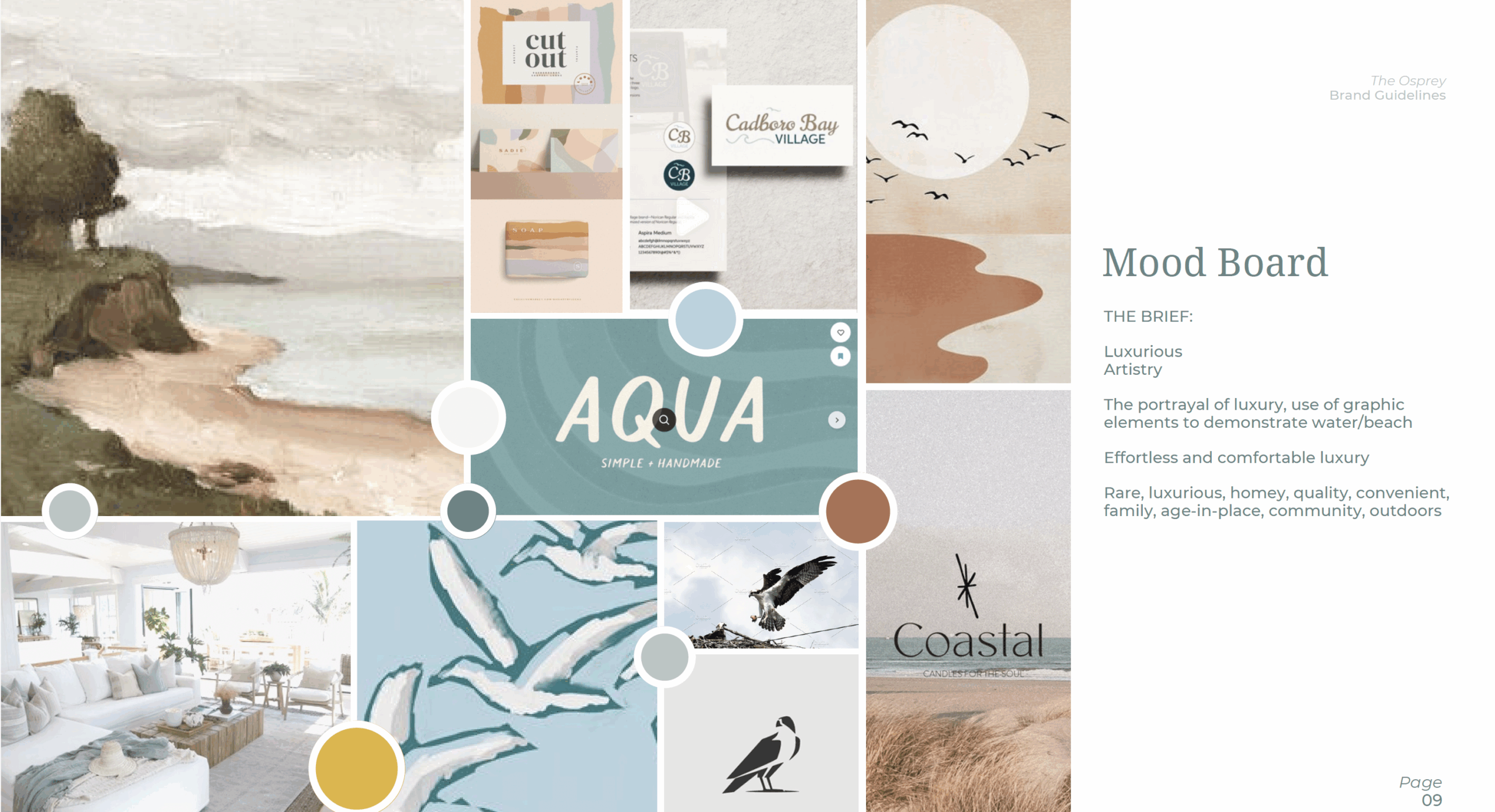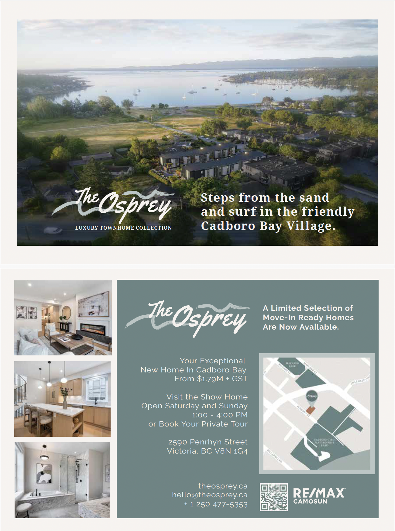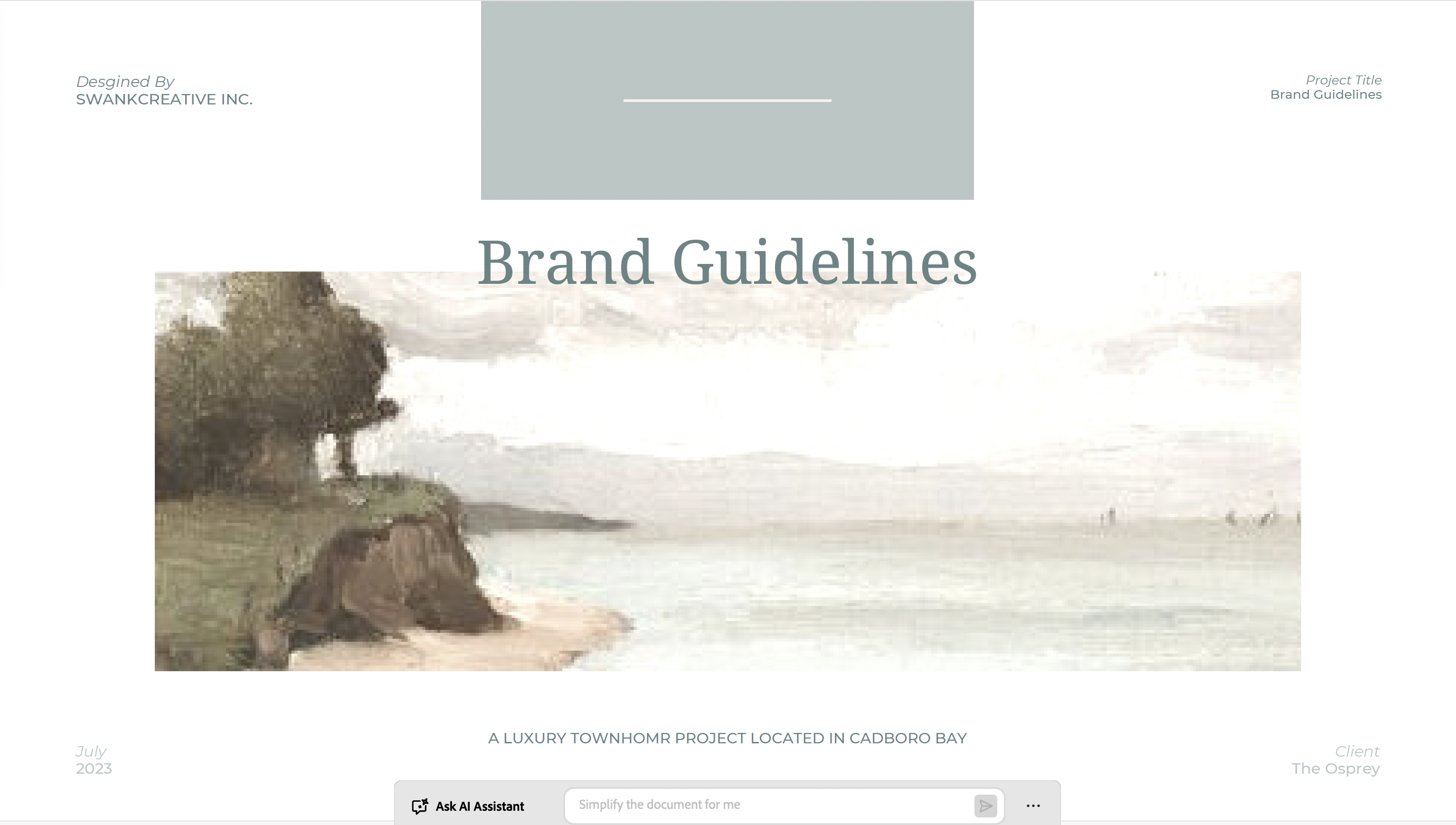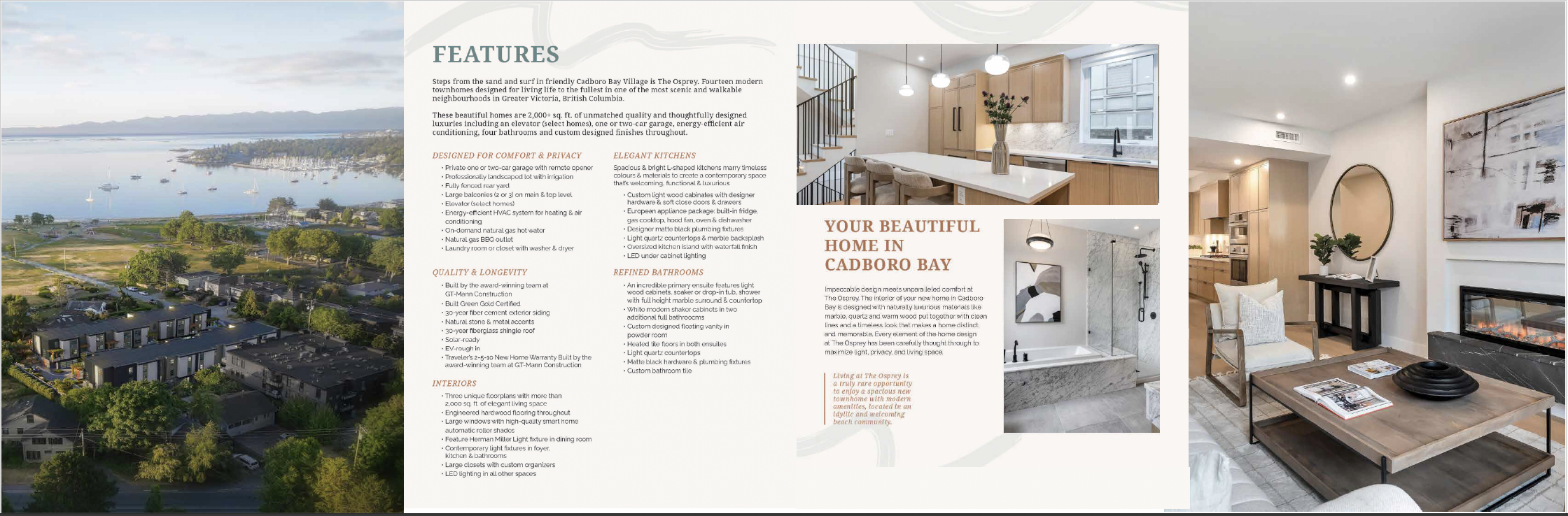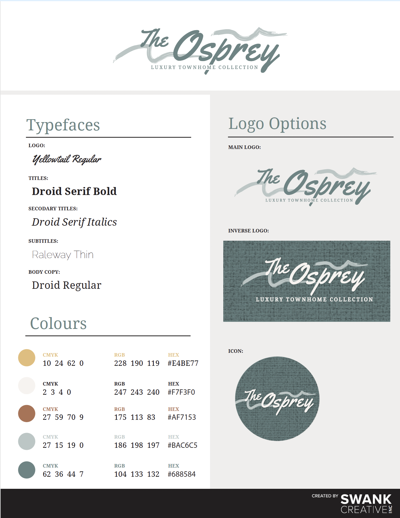 We began by establishing a cohesive visual identity for The Osprey—one that reflected the elegance and exclusivity of the seaside townhomes. Through conversations with the project manager and Christine herself, we explored their vision, target buyer profiles, and local competitive landscape. We delivered a comprehensive branding style guide that outlined logo use, colour palette, typography, tone of voice, and imagery direction—setting the tone for all future communications and materials.